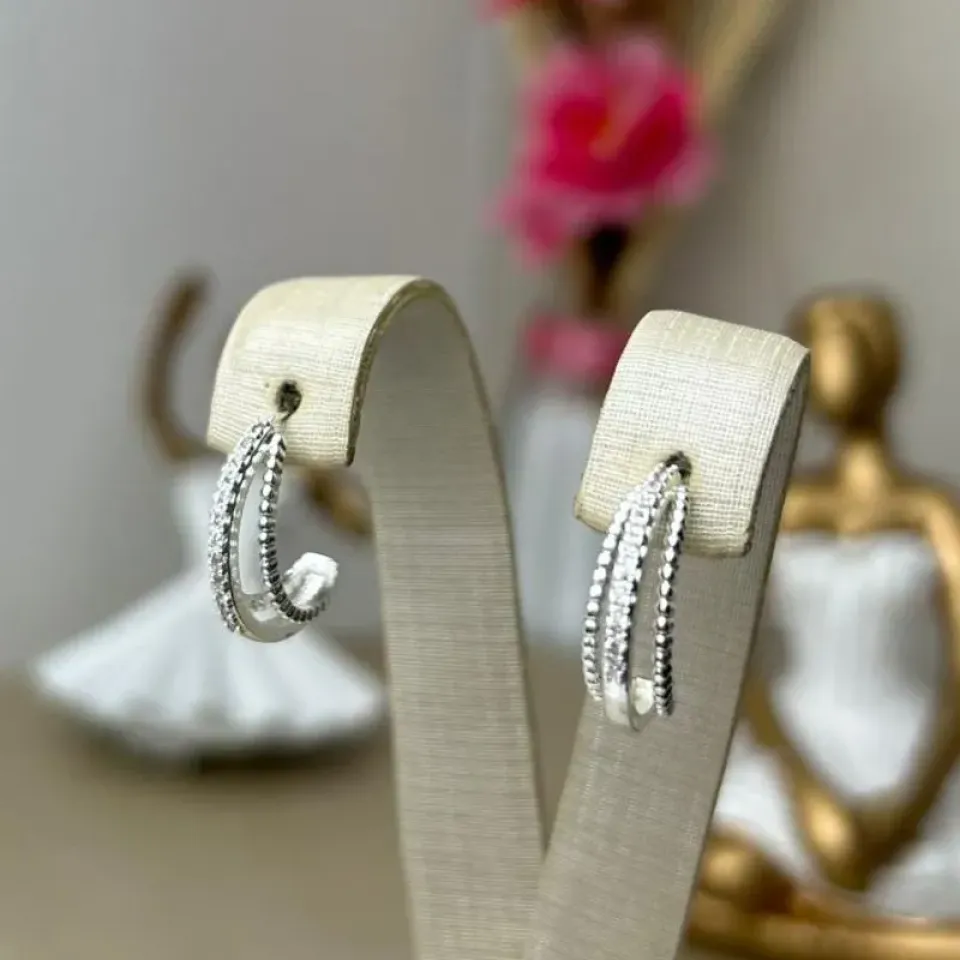 Brinco Meia Argola com Aro Triplo Cravejado Banhado a PrataConfira opiniões e avaliações de clientes!