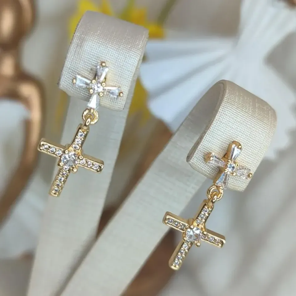 Brinco Cruz Dupla Cravejado Banhado a Ouro