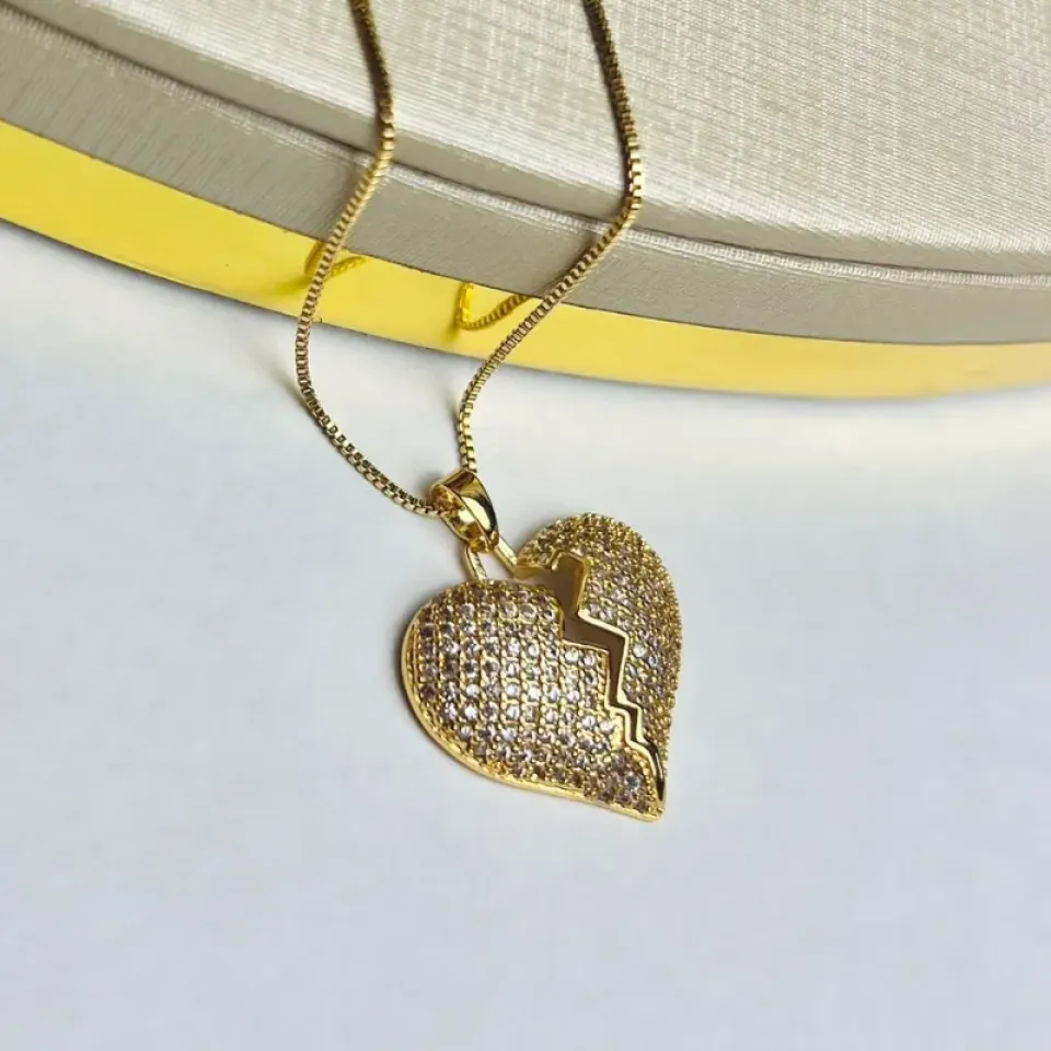 Colar Coração Partido Cravejado Banhado a Ouro