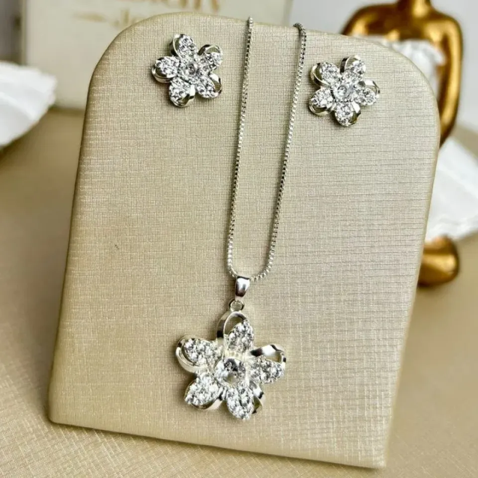 Conjunto Flor Cravejada Banhada a PrataConfira opiniões e avaliações de clientes!